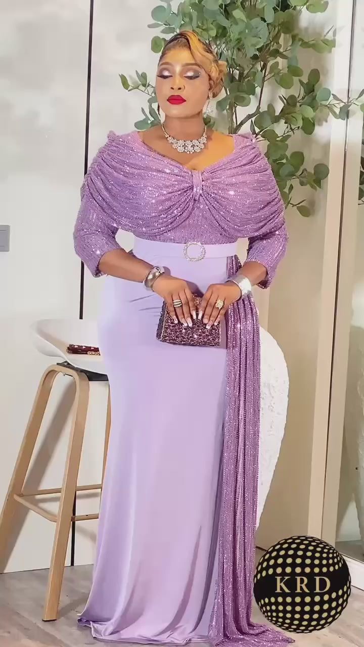 Step into the spotlight with this breathtaking lavender evening gown, crafted exclusively for the woman who adores sophistication and unforgettable style. This stunning piece features a beautifully draped sequined bodice that forms a glamorous layered bow design across the neckline, adding a bold touch of luxury and elegance. The three-quarter length sleeves offer a refined finish, perfectly complementing the shimmering upper detail.