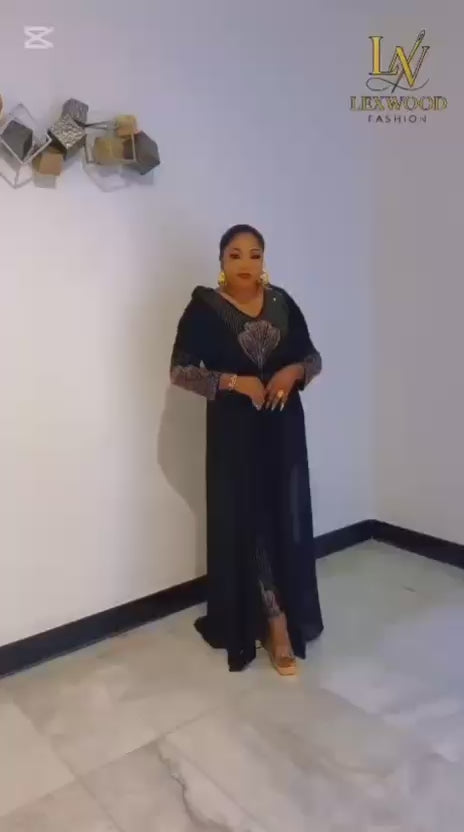 This elegant Luxury Cape Navy blue Top and Trouser Set from Godshand Fashion Empire is crafted for women who love modern sophistication with a rich touch of glamour. Designed in premium Turkish fabric, the set features a beautifully embellished top with a flowing cape overlay that creates graceful movement and a stylish layered effect.
