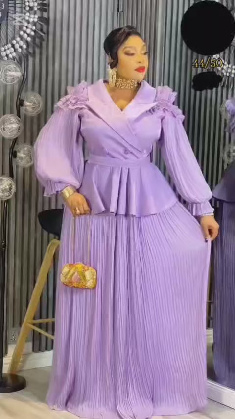 This elegant lavender pleated maxi dress creates a soft, refined look that’s perfect for weddings, church programs, birthdays, and special events. The peplum-style bodice features layered ruffle details across the shoulders, adding texture and sophistication. Flowing pleated sleeves and a full pleated skirt give beautiful movement with every step. Ideal for women searching for lavender maxi dresses, classy church outfits, African luxury event wear, and modest elegant dresses that stand out effortlessly.